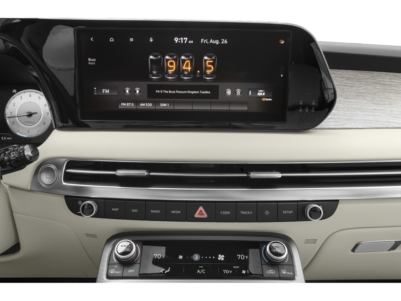 - Radio: AM/FM/MP3 Premium Audio System -inc: 630-Watts, 12.3" color touchscreen display, onboard navigation w/traffic flow including incident data via HD Radio (HERE), Over-the-Air (OTA) map updates, Harman Kardon audio system w/12-speakers, Quantum Logic Surround, Clari-Fi, SiriusXM, Android Auto and Apple CarPlay, USB, dynamic voice recognition, rear seat quiet mode, passenger talk (in-car intercom), Bluetooth® hands-free connectivity w/multiple device connection and Bluelink Connected Car System