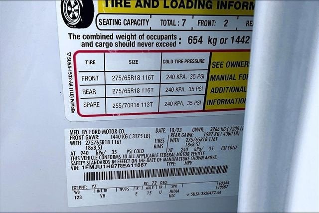 RECALL NOTICE: Some vehicles available for sale may have unrepaired safety recalls issued by the manufacturer. To check the recall status of any vehicle, please visit www.nhtsa.gov/recalls. **LOCAL TRADE**, PREMIUM AUDIO, PREMIUM WHEELS, SECURITY SYSTEM, Expedition XLT, 4D Sport Utility, EcoBoost 3.5L V6 GTDi DOHC 24V Twin Turbocharged, 10-Speed Automatic, RWD, Oxford White, Black Onyx Premium Synthetic, 110V/150W AC Power Outlet, 18 Machined-Face Aluminum Wheels, 2nd Row Power-Folding Captain's Chairs, 3.31 Axle Ratio, 3rd row seats: split-bench, 3rd Row Vinyl Head Restraints, 4-Door Intelligent Access (Lock/Unlock), 4-Wheel Disc Brakes, 6 Speakers, ABS brakes, Accent Color Painted Rear Bumper, ActiveX-Trimmed 1st & 2nd Row Seats, Advanced Security Pack, Air Conditioning, Alloy wheels, AM/FM radio: SiriusXM with 360L, Ambient Lighting, Auto High-beam Headlights, Auto-dimming Rear-View mirror, Automatic temperature control, Brake assist, Bumpers: body-color, Cloth Front Captain's Chairs, Compass, Delay-off headlights, Driver door bin, Driver vanity mirror, Dual front impact airbags, Dual front side impact airbags, Electronic Stability Control, Emergency communication system: SYNC 4 911 Assist, Equipment Group 202A High Package, Exterior Parking Camera Rear, Four wheel independent suspension, Front anti-roll bar, Front Bucket Seats, Front Center Armrest, Front dual zone A/C, Front License Plate Bracket, Front reading lights, Fully automatic headlights, Garage door transmitter, Heated door mirrors, Heated Steering Wheel, Heated/Ventilated Front Seats, Illuminated entry, Leather steering wheel, Low tire pressure warning, Navigation system: Connected Navigation, Occupant sensing airbag, Outside temperature display, Overhead airbag, Overhead console, Panic alarm, Passenger door bin, Passenger vanity mirror, Power door mirrors, Power driver seat, Power Liftgate, Power steering, Power Tilt/Telescopic Steering Wheel w/Memory, Power windows, Power-Adjustable Pedals w/Memory, Power-Folding Sideview Mirrors w/Autofold, Radio data system, Radio: AM/FM Stereo w/MP3 Capable, Rear air conditioning, Rear anti-roll bar, Rear reading lights, Rear window defroster, Rear window wiper, Reclining 3rd row seat, Remote keyless entry, Remote Start, SecuriCode Keyless Entry Pad, Security system, SiriusXM w/360L, Speed control, Speed-sensing steering, Speed-Sensitive Wipers, Split folding rear seat, Spoiler, Steering wheel mounted audio controls, SYNC 4 w/Enhanced Voice Recognition, Tachometer, Telescoping steering wheel, Tilt steering wheel, Traction control, Trip computer, Variably intermittent wipers, Voltmeter, Wireless Charging Pad.